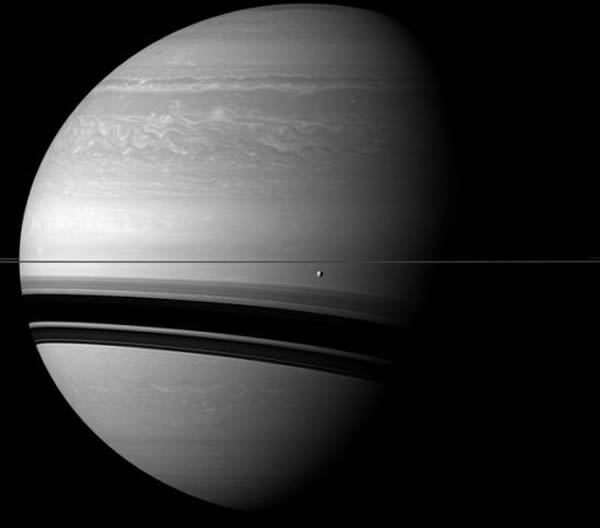“卡西尼”号飞船拍摄的另一幅照片,展现了土星和土卫三“特提斯”。照片中,土卫三悬浮在土星环下方