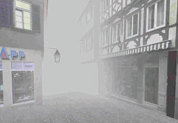 他们戴上一个可以显示城镇3D模型的虚拟现实头盔,虽然这个城镇是他们非常熟悉的,但是他们通过头盔所呈现的城镇街道充满了雾。测试者在盲视的情况下必须指出无法看到的地方位置,例如:消防站。
