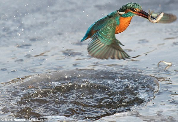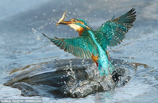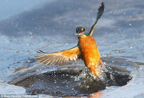 获得摄影奖的48岁野生动物摄影师马克-汉库克斯(Mark Hancox)拍摄到一只富有勇气的翠鸟能够克服冰冷气候,潜入结冰湖面的水洞之中捕猎鲦鱼。据悉,汉库克斯是在英国乌斯特郡德罗伊特威奇地区自已住宅附近的一个私人池塘拍摄的,在1月16日早上,气温下降至零下5摄氏度,这是目前这个冬季最寒冷的一天。
