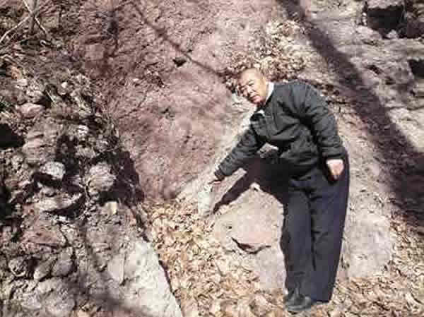 随后,记者随同李广达和王森海来到安家沟。在安家沟广场西20米处的山脚下,李广达指着一处凹槽说,石磨盘和石磨棒就是在这里被发现的。李广达回忆,2005年4月,景区在这里修建一个人工小瀑布,他是承揽这项工程的包工头。一天,他正指挥民工在山脚下清理砂土碎石挖水渠时,民工在土层中发现一些像煤炭一样的渣子,当时大家谁也没有在意。之后,一位民工挖出一小块磨制的石器残片,引起了李广达的注意,民工们也对这块小石块感到好奇。李广达怀疑里有墓葬,便让民工不要用镐头了,用铁锹轻轻挖。当挖了约60厘米深的时候,一位民工突然喊道,这里有一根石棒。随后,又挖出一个表面有弧度的石板。擦去附在石棒和石板上面的沙土,发现石棒和石板都不像是天然的,看上去像是精心打磨过。正在附近忙碌的安家沟景生态管理区经理王森海,听说这一发现后急忙跑了过来。他意识到,这也许是一个重大发现,于是向桥西区文体局文化顾问刘振英反映了这一情况。