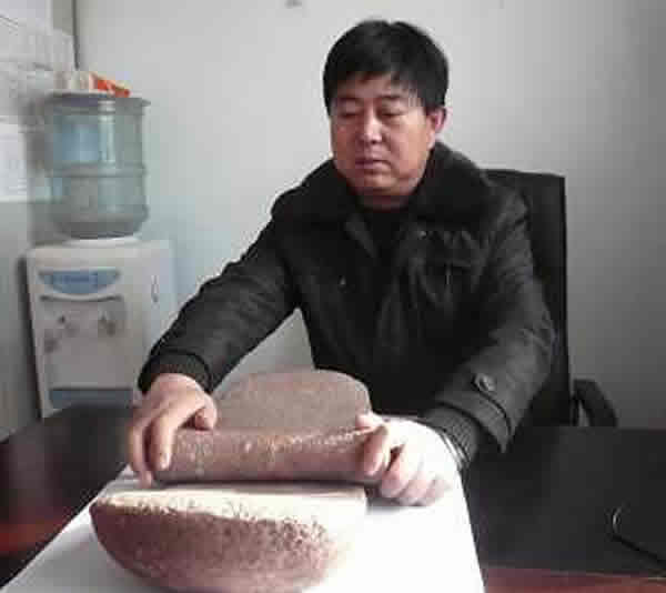 近日,记者采访了安家沟生态旅游区经理王森海。王森海说,安家沟的确发现了石磨盘、石磨棒,时间是2005年。因种种原因,这件事一直没有正式对外公布。王森海从一个柜子里小心翼翼地拿出紫红色的石磨盘和石磨棒。石磨盘边缘圆润,表面有明显的规则弧度,盘中心低凹。仔细端详可以发现,盘面并不光滑,有着许多坑坑洼洼的“斑点”。石磨棒打磨精细,中间比两边略细一些。石磨盘、石磨棒是由红砂岩打磨而成,而安家沟的山石主要是片状的红砂岩。王森海说,石磨盘、石磨棒的发现者是东窑子镇元宝山村民李广达。