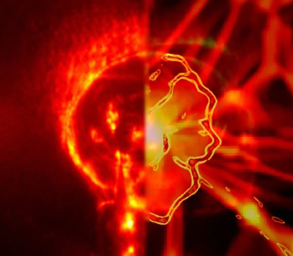 磁场在宇宙中随处可见,即使看似不应该存在磁场的地方都有它们的“身影”,比如星系团之间巨大的宇宙空间就存在着看不见的磁场作用。格雷戈里将发现磁场的形成归类为“推动力的问题”,正是恒星在引力坍缩下发生了爆炸,形成冲击波和震荡,是推动磁场形成的关键因素,这一切发生在星系形成之前。图1中显示实验室模拟爆炸产生的冲击波,红色代表了温度较高、密度较大的区域。