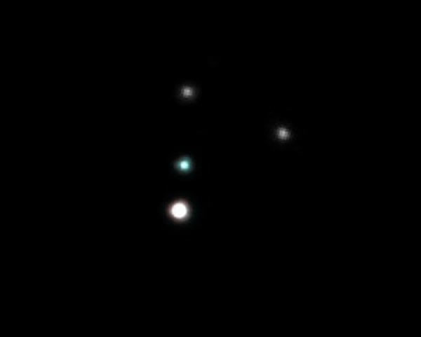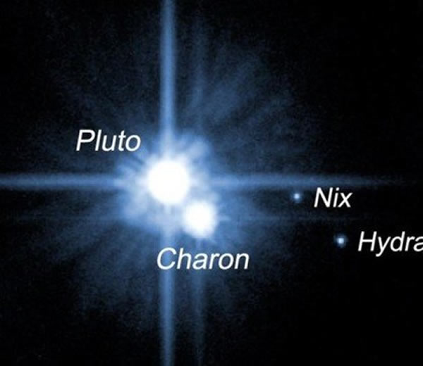 哈勃空间望远镜在2005年5月观测到的冥王星天体系统,正下方最亮的白色点便是冥王星(Pluto),在冥王星正上方青色的点是最大的卫星卡戎(Charon),并发现了另外两颗昏暗的点,它们分别是尼克斯(Nix)和许德拉(Hydra),第四颗新发现的卫星编号为P4。该发现由美国国家航空航天局、欧洲空间局以及哈勃空间望远镜冥王星搜索小组合作完成。