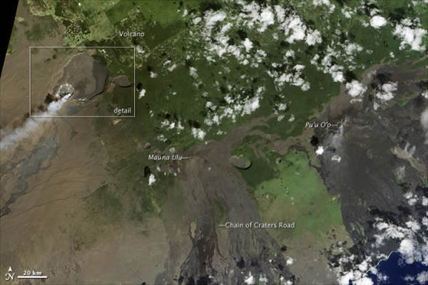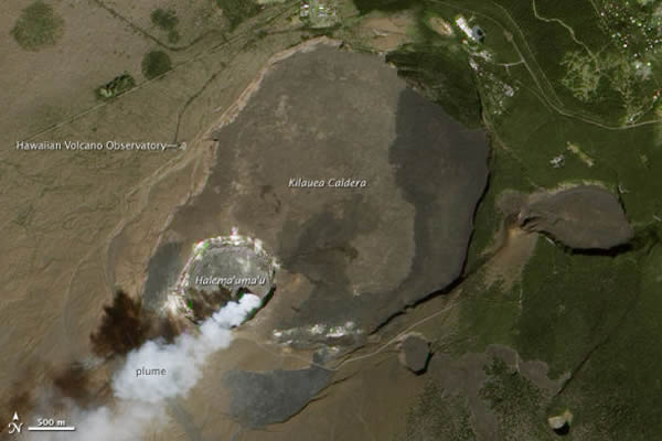 NASA地球观测卫星1号(EO - 1)上的先进陆地成像仪(ALI)于2012年1月28日拍下了这两幅自然色照片。其中,第一幅是基拉韦厄火山口和夏威夷火山观测站的特写图,第二幅是基拉韦厄峰(Mauna Ulu)和Pu’u ’O’o火山口的宽域图。在基拉韦厄火山口之内还有一个火山口,叫哈拉玛乌玛乌火山口(Halema’uma’u Crater),一股细小的水蒸气从该火山口中向南飘去。
