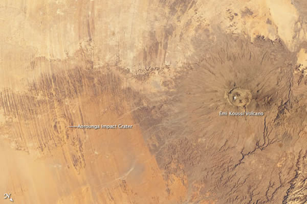 乍得埃米-库西火山是一种相对罕见类型的火山--火山碎屑盾状火山,它是由火山爆发性喷发喷出的火山碎屑堆积于火山口周围形成的。库西火山位于乍得境内,仍然被认为是处于潜在的活跃状态。不过,该火山最近一次的大规模火山活动时间没有明确记载。乍得的低风化速率表明,自库西火山上次大规模喷发到现在可能已有数千年或更长时间。本图由美国宇航局“地球观测卫星”所拍摄,显示的是乍得境内的库西火山(右)和奥朗加撞击坑。