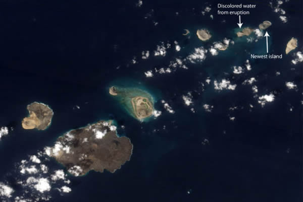 红海祖拜尔火山的喷发似乎已平息下来。由于没有令人讨厌的火山灰羽状物,因此我们可以从本图中清晰地看到红海中新形成的岛屿。这个岛屿看起来很坚固,因此不太可能因为波浪或风暴的原因而快速消失于红海之中。事实上,如果从整体上看整个祖拜尔群岛,你就会发现这个新岛屿很醒目。它表明,在火山活动区内,形成一个新岛屿的速度是多么地快。注意本图中数量众多的火山锥,几乎每一个岛屿都有一个火山坑,某些岛屿上甚至还有多个清晰可见的火山坑。本图底部的那个较大岛屿上,似乎还有新的黑色熔岩流形成。本图拍摄于1月15日。