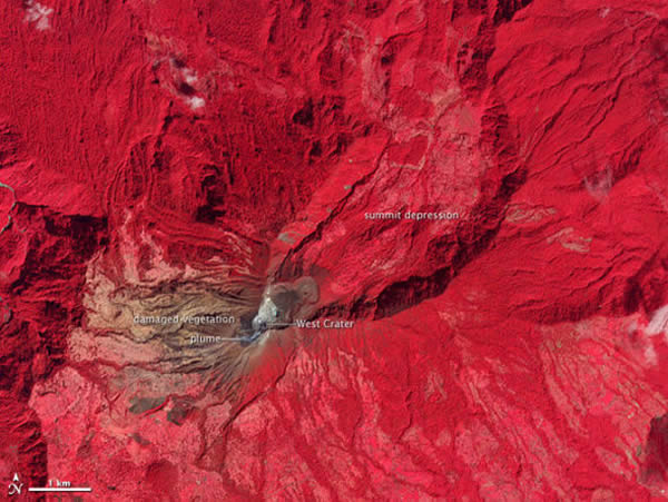 在哥斯达黎加图里亚巴火山活跃火山坑的背面,可以看到新形成的一个火山口。这幅伪色图拍摄于1月22日。