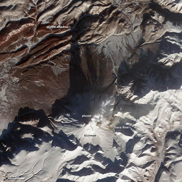 俄罗斯堪察加半岛的火山活动情况一直是《每周火山活动报告》的重点内容。本图中的基泽门火山、卡里米斯基火山和什维鲁奇火山仍在持续小规模喷发,穹顶正在逐渐形成。本图拍摄于1月11日,显示了基泽门火山形成的水蒸汽和火山灰羽状物。