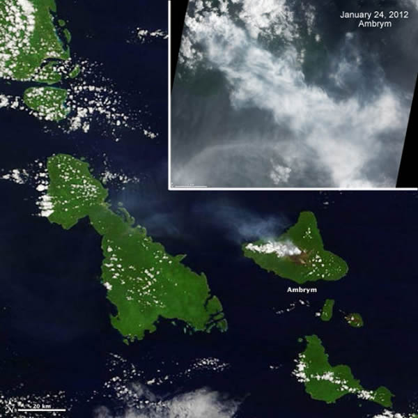 瓦努阿图安布里姆火山位于南太平洋,该火山的熔岩湖正释放出明显的水蒸汽和硫磺羽状物。这种水蒸汽和火山灰混合物对火山周围的植被构成严重的威胁,特别容易损伤植被的枝叶。在瓦努阿图群岛上,安布里姆火山和雅苏尔火山被认为是相对活跃的火山。本图拍摄于2012年1月下旬。
