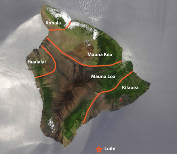 上周,夏威夷基拉韦厄火山上的哈勒马乌马乌火山口的熔岩湖变得异常活跃。在美国地质勘探局发布的一系列视频中,普乌奥奥火山口也呈现熔岩湖活跃状态,一个小型熔岩湖形成于火山坑底部。在夏威夷大岛上,并不只有基拉韦厄火山。共有5座火山组成了这个岛屿,从最古老的到最年轻的分别是:科哈拉火山、莫纳克亚火山、华拉莱火山、莫纳罗亚火山和基拉韦厄火山。此外,一座新的火山(洛伊希火山)正形成于近海中。在所有这些火山中,除了科哈拉火山,其他火山都被认为是处于潜在活跃状态。本图显示了夏威夷大岛上的5座火山和近海形成的一座新火山。