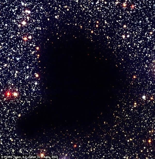 图片展现了十分怪诞的宇宙景象,四周布满明亮的恒星,中央却是一个巨大的“黑洞”,但这可不是黑洞,而是天文学家们所称的“暗分子云”。这些分子云阻挡了它们后方的星光,因此在我们看来这里就显得漆黑了。