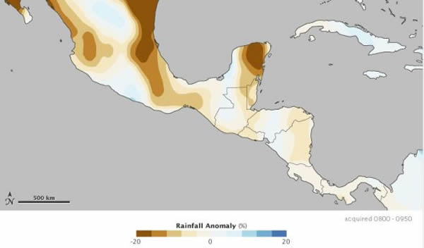玛雅文明覆灭的一个可能的解释是干旱。中美洲的气候比较干燥,但最近的一项研究表明,玛雅人的活动可能加深了气候的干燥。为了维持极高的人口密度,玛雅人拓展了耕地。他们几乎毁灭了所有的森林,把林地变成了农田。第一幅图显示了玛雅时代末期原生森林(深绿色)已经锐减到怎样的程度。
