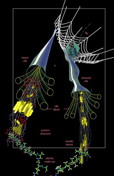科学家已经证明,蜘蛛丝为何比同等重量的钢的强度大五倍。蜘蛛丝包含两种类型的丝,一种是来自中心的坚硬、干性的丝,可将所有的丝凝聚在一起;另一种是更细更有粘性的丝,用于捕获猎物。科学家还发现这两类蛛丝都可以离开原来的位置而不折断,所以仅有一根丝会折断。俄亥俄州阿克伦大学的生物学家托德 A.布莱克利奇( Todd A. Blackledge )没有参与这项研究,他说:“蜘蛛网为蜘蛛成功捕获猎物发挥了重要的作用。丝在冲击下拉伸,抱住昆虫,所以它不容易逃脱。”