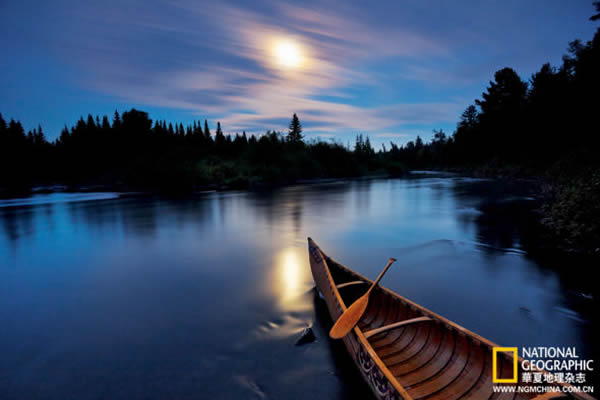 一条桦皮舟沐浴在月光里。这是缅因州的“阿勒加什荒野航路”,划艇者挚爱的清静胜地。