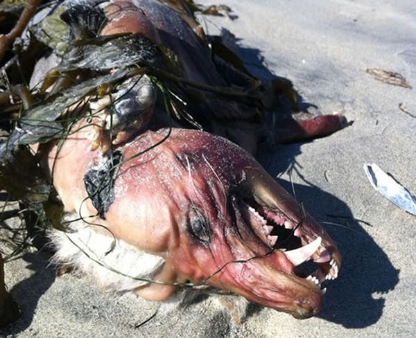 近期,目击者在美国加州圣地亚哥海滩发现一具神秘动物尸体,由于死亡时间较早,长时间被浸泡已褪去皮毛,阳光已晒黑它的皮肤,长着凶恶的尖牙。人们猜测它可能是传说已久的吸血怪兽。