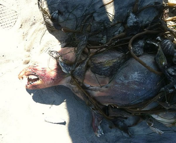 这个动物死尸长24英寸,散发出恶臭,是上周由一位19岁滑板男子在圣地亚哥太平洋海岸拍摄的,他将这些照片展示给朋友,从而将这些照片传播开来,随后这些照片在互联网站上点击率骤增。