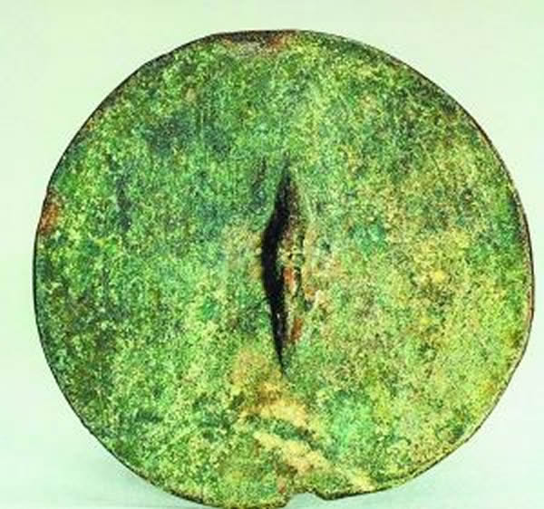 甘肃广河齐家坪墓葬出土的铜镜,镜背无纹饰,圆形,直径6厘米,厚0.3厘米。弓形小钮,钮高0.5厘米。青海贵南尕马台25号墓出土的一面铜镜,也为圆形,直径8.9厘米,厚0.3厘米。镜背有凸起的两周弦纹,在两周弦纹间再饰直线纹和人字形弦纹。镜钮残损,镜边缘有相邻的两个小孔,孔间有清晰的凹沟,显然是镜绳磨出的痕迹。两面齐家文化铜镜的形体都较小,而且外表也均显粗糙,表现出了铜镜的初始形态。
