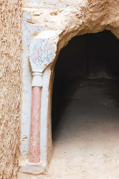 壁画墓位于统万城遗址南约4公里处八大梁墓地,它门口仍有封门砖。去掉封门砖后,仿佛来到北魏石窟的门口,土上雕刻立柱、拱形门,并施以彩绘。这和其他墓葬门明显不同,原来这就是仿石窟门造型。
