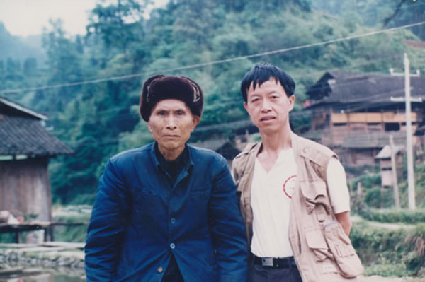 作者(右)意外遇见了捕捉姑妖溪女野人的老民兵吴作昌(左)。