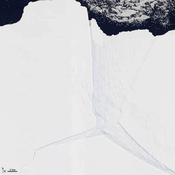 照片呈现了艾默里冰架的一小部分,其中有三条巨大的裂缝交汇。最大的那条裂缝与冰流的方向相同,并且逐渐变宽(照片中央)。