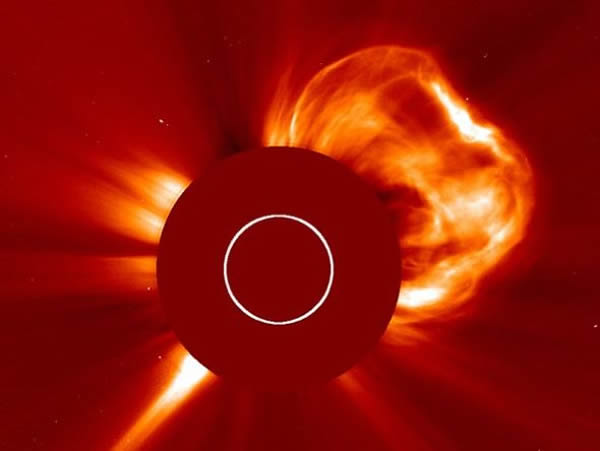 1月末,美国宇航局的太阳和太阳风层探测器观测到一次日冕物质喷射。最近,宇航局公布了这幅展现日冕物质喷射的图片。发生物质喷射时,巨大的带电粒子云以每小时560万英里(约合每小时900万公里)的速度进入行星际空间。虽然并没有正对地球,但地球上还是因此出现一次小规模辐射风暴。