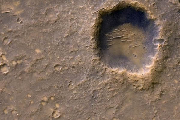 此前拍摄的火星上一个沙丘原野的低解析度照片显示存在一个撞击陨坑。由于这个沙丘原野的历史只有数万年,存在陨坑令科学家感到吃惊。绝大多数大型火星陨坑据信都在大约40亿年前的后期重轰炸期形成。美国宇航局火星侦察轨道器超高分辨率成像科学实验照相机(HiRISE)拍摄的一幅新高解析度照片显示,这个“陨坑”是一种错觉。整个沙丘原野充斥着大量明显的脊和平滑的斜坡,这些都是形成不久的沙丘的典型特征。