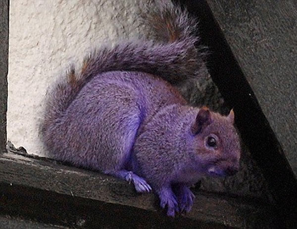 珀西·埃莫特和妻子康妮家住泽西肖尔,因为家里时常会有松鼠跑进来偷吃鸟食,他们就在院子里支起了网进行阻止。通常他们都会把捉到的贪吃松鼠放回到树林中,然而在发现捉到了一只与众不同的紫色松鼠后,他们觉得很有必要让更多的人都见识一下。珀西说,“这只松鼠的毛全是紫色的,就连耳朵里面都是这种颜色。”松鼠罕见的颜色引发了各种猜测,一位气象学家就做出了有趣的猜想,称松鼠一向活跃会跑到各种场所,这只紫色松鼠可能掉进了紫色墨水或颜料中。