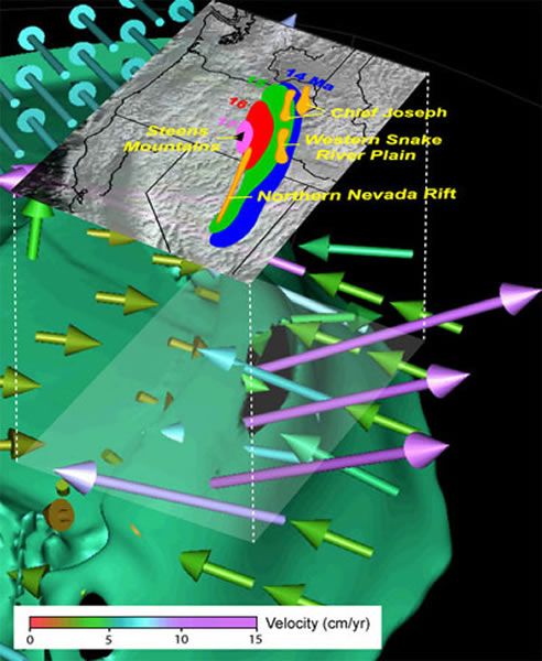 科学家创建计算机模型演示美国西部地幔层下的复杂结构在过去的4000万年里如何演变。他们的研究利用来自美国地震台阵(USArray)的数据,该台阵由400个宽频带地震台站组成,以向前滚动的方式扫过美国本土。通过地球动力模拟,科学家发现,大约1700万年前,潜伏在美国西部地下的一个称为费拉隆板块(the Farallon slab)的巨大岩石块开始撕裂,这导致大量的岩浆喷发。这次事件在空间和时间上都与“斯廷斯-哥伦比亚河泛布玄武岩事件”一致。加州大学圣迭戈分校的地球物理学家戴夫•斯特格曼(Dave Stegman)说:“当板块刚开始裂开,只有一点点裂缝,但由于在高压力下,板块迅速裂成一个大洞,就像电影中,飞机在高空飞行,窗户玻璃突然破裂,因为机舱内的压力更高,机舱内所有东西都从窗口涌出。”
