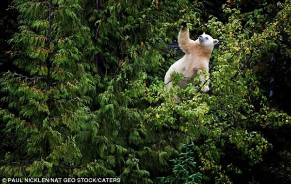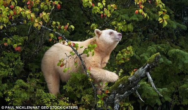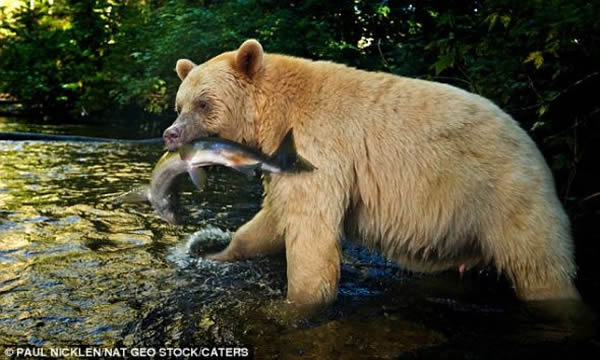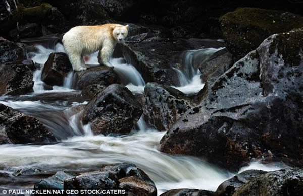 这头美丽独特的动物是北美黑熊的白色变种,这种又被称作柯莫德熊(Kermode bear)的动物生活在英属哥伦比亚地区的茂密森林里。它曾被认为是一个虚构的故事,这种传奇动物现在对英属哥伦比亚地区的人来说非常珍贵,政府部门已经规定,射杀这种熊属于犯罪,射杀一头的罚款高达10万加元。野生生物摄影师现在从世界各地蜂拥至此,希望有机会用手中的相机捕捉到罕见的白熊,然而由于极其稀缺,他们的这个愿望几乎很难实现。