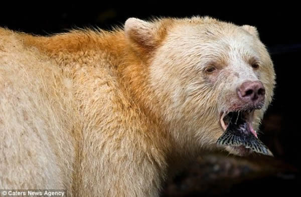 这种传奇动物现在对英属哥伦比亚地区的人来说非常珍贵,政府部门已经规定,射杀灵熊属于犯罪。该照片显示的是这头熊嘴里含着一条大鱼