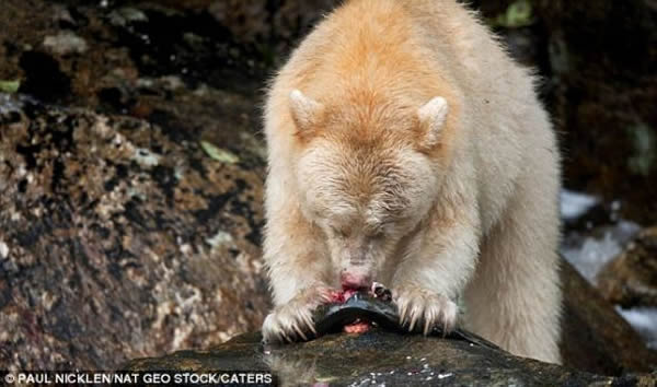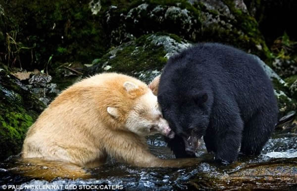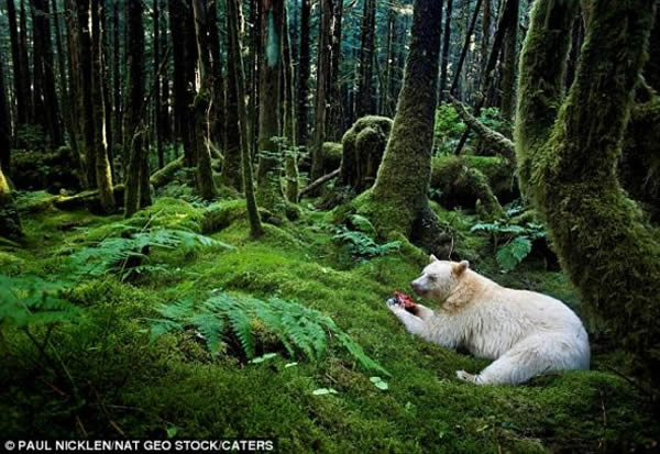不过一名非常幸运的摄影师在这种动物的自然栖息地拍摄到这一系列照片,他就是保罗-尼克林。43岁的他家住加拿大温哥华,他说:“这头小熊白的令人吃惊,它不是一头北极熊,目前全球仅剩200头,它比大熊猫还要珍稀。我在这片森林里坐了2个月也没看到一头,因此我确信自己会两手空空地返回去。但是2个月后的一天,这个令人难以置信的白色雄性大家伙出现在距离我大约3英尺(0.91米)地方,它捉到一条鱼后吃掉了。接下来的一整天我都跟着这头熊在森林里穿梭,这正是我儿时的梦想生活。我必须设法在距离它不超过3英尺(0.91米)的地方入睡,给它拍照,这确实是一次非常不可思议的经历。”