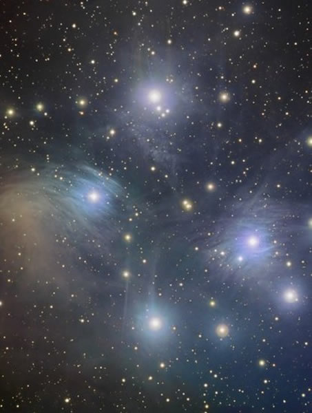 同样在金牛座,位于毕星团的左方便是昂宿星团,简称昂星团。它们由七颗最亮的恒星组成,毫无疑问它们是银河星团中最著名的。一般情况下只能用肉眼看到6至7颗的恒星,要看到更多星团中的恒星则需要非常优秀的视力。星团中大约有250颗的恒星,而且最亮的七颗恒星被星际尘埃所笼罩。昂星团距离我们410光年,跨度达20光年,最老的恒星也不过2000万年。如同冰蓝色的钻石般闪耀。