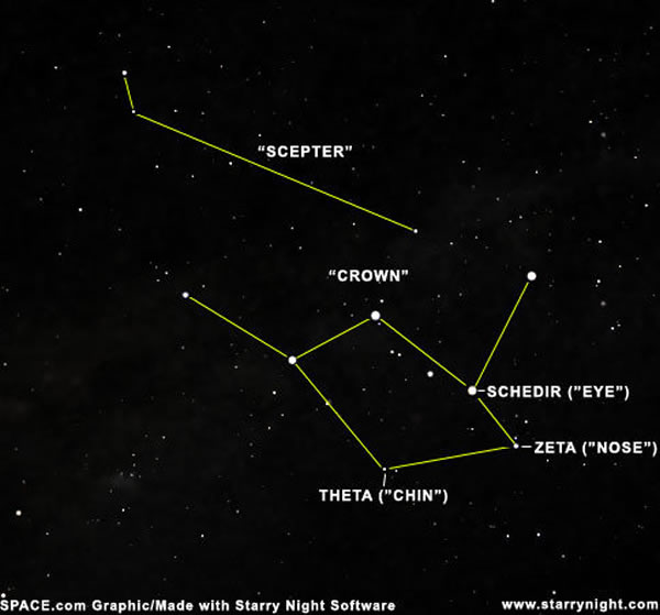 如果往西北天空较高位置观察,可以看到五个闪闪发光的星星构成锯齿形的外观组成了仙后座。在距离仙后座γ与仙后座δ(阁道三)1.5倍的地方,透过双筒望远镜就可以看到微弱的星光,它们是两个壮丽、模糊的星团。通俗地说,它们是“双星团集群”,形似英仙座的执剑手,是天空中最著名的“景点”之一。通过双筒望远镜可以看到两个NGC 869和884一对天体,大小约为满月直径的三分之一,更好的望远镜则可以揭示NGC884中发出红宝石光芒的恒星。