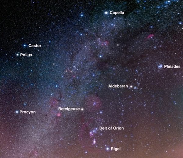 在东边的天空中,只需抬头便能看到双子星座:双子座α(Castor)与双子座β(Pollux),想两个手牵手的兄弟。天文学家亨利·尼利(Henry Neeley)在上个世纪四十和五十年代常常在纽约天文馆观测长楔形的双子星座,双子座α(北河二)与双子座β(北河三)天体共同组成了双子星座的头部,而双子座γ(井宿三)则是其中一个兄弟的腿部。