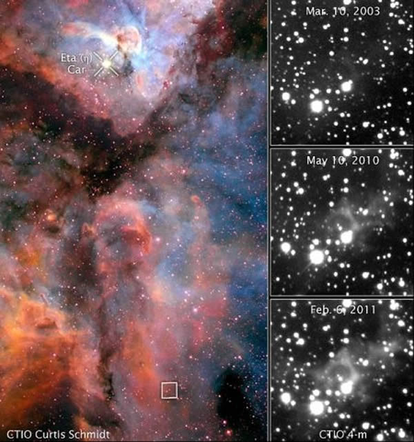 “空间取证”技术已经帮助我们揭开19世纪发生的被称作“大喷发(Great Eruption)”的一次神秘的恒星事件,当时恒星——船底座伊塔星(Eta Carinae)突然变成夜空中第二亮的星体。船底座伊塔星是我们银河系最庞大的一颗恒星,19世纪它的亮度突然增强。在19世纪中期的10年间,它一直是夜空中第二亮恒星。由美国太空望远镜科学研究所的阿明-莱斯特领导的这个科研组,利用船底座伊塔星的图片研究“大喷发”的光回波。他们观察被距离这颗恒星几十光年的星际尘埃反射回来的这次喷发产生的光。这几十光年意味着现在到达地球的光并不是19世纪地球上的人们看到的直接传播到这里的光。