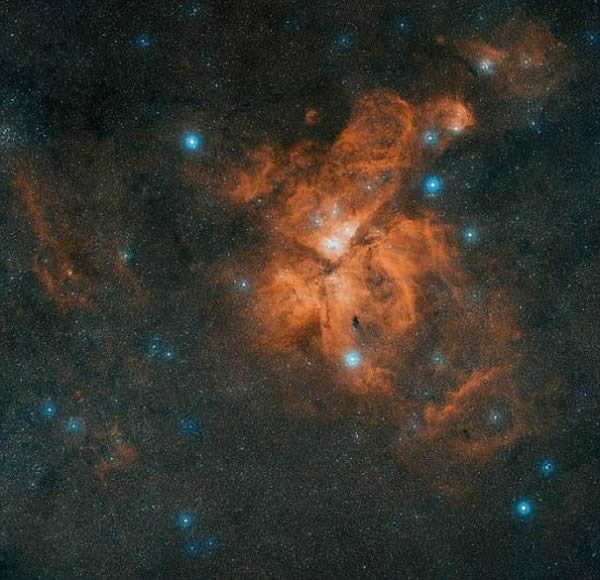 数字化巡天捕捉到的船底座伊塔星的星云区。这颗恒星在19世纪的很多年间一直是夜空中的第二亮星,现在天文学家正在重现导致这一结果的恒星事件