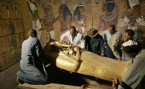 考古工作者将古代埃及最著名的法老之一图坦卡蒙的木乃伊石棺揭开