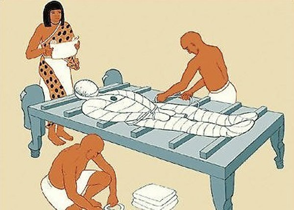 首先,尸体被送到“制木乃伊之屋”,在这里进行制作木乃伊的第一步。把尸体摆在专门的桌上。奇怪的是,做木乃伊的桌都很矮,只有半米高。先敲碎筛骨,把一个金属钩从鼻子里面伸进去,在里面把脑髓搅碎,然后把木乃伊头朝下,脑髓就从鼻孔里留出来了。在碗里放上酒,再从鼻孔向里面灌,清洗消毒。
