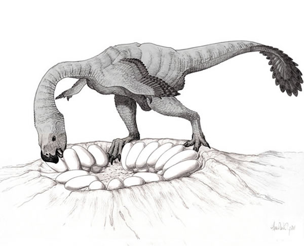 据研究人员称,这个带有羽毛的窃蛋龙很明显是突然意外死亡,可能死于0.7亿年前一场沙尘暴,当时它正在巢窝中孵化恐龙蛋。古生物学家费德里戈-方蒂、菲利普-科瑞和德姆奇格-巴达姆加拉维在《公共科学图书馆·综合》杂志上撰文称,这只窃蛋龙的脚放在环状恐龙蛋中心位置,前臂交叉折叠在身体两侧的恐龙蛋。