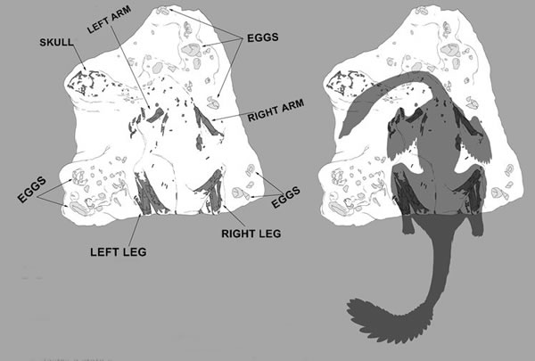 研究人员在窃蛋龙头骨下方、颈部左侧、肱骨左侧、股骨左侧以及双足附近,发现大量恐龙蛋碎片。据悉,考古学家长期以来错误地认为窃蛋龙是“偷蛋高手”,窃蛋龙具有复杂的社会群体结构和行为特征。
