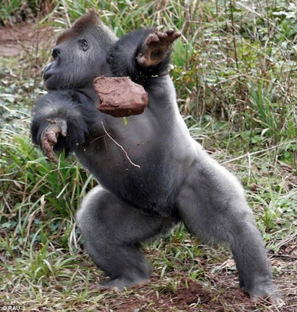 据称,大猩猩对着镜头发飙扔石块,摆出一副盛气凌人的架势,实际上是在警告摄影师,“它才是这里的老大。”一旦摄影师被它扔的泥巴石块吓得离开了,它就会认为自己打赢了。