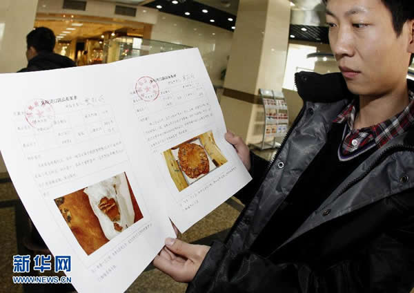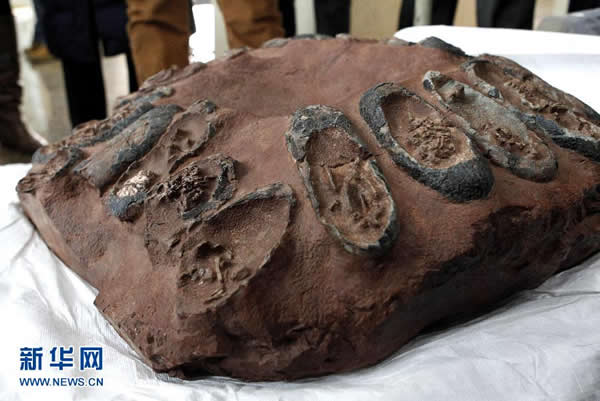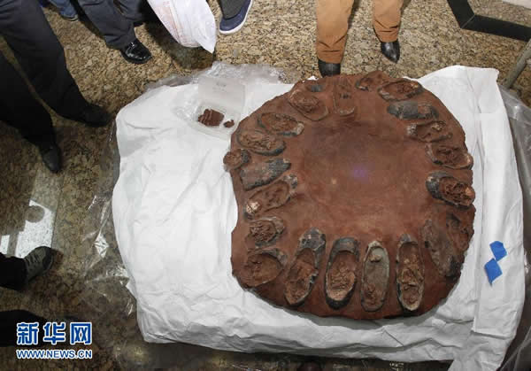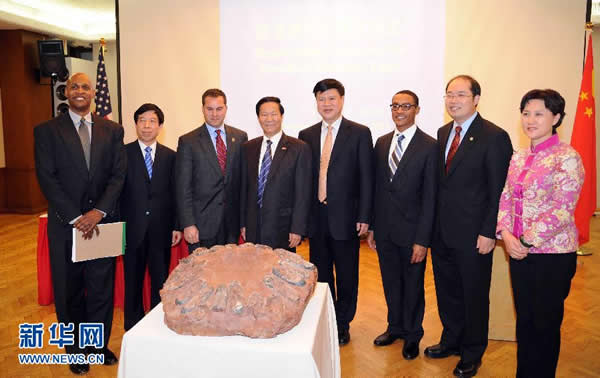这是中、美双方代表在美国交接“恐龙蛋窝”化石(2011年12月1日摄)。