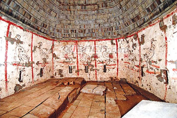 壁画发现于墓道、甬道和墓室,墓室四壁发现10只仙鹤,呈屏风状,共有10屏,每屏高约2米、宽约1米。专家介绍说,这些仙鹤都是单笔勾绘而成,特别是朱红顶、黑喙和黑腿,正是我国古代被描绘为仙鹤的“丹顶鹤”,在我国传统文化中是长寿、吉祥和高雅的象征。