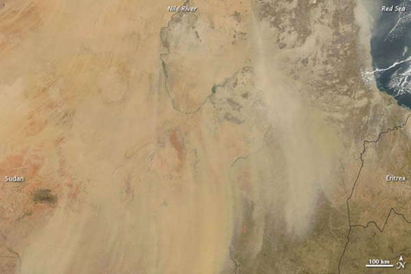 尼罗河蜿蜒向北流经苏丹,在苏丹境内向东绕了一个大圈,然后折回西边。上午,尼罗河的大部分仍然可以辨认,但到了下午,沙尘暴遮盖了尼罗河的大部分流域。红海上空的沙尘暴在下午也变厚,尽管西部的天空变得清晰了一点。