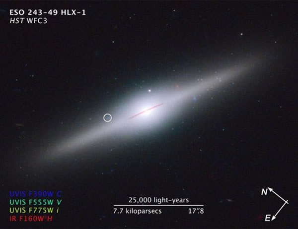 哈勃WFC3拍摄的星系ESO 243-49,圈中就是HLX-1所在的超级星团。由于配色缘故,整个图像偏绿。大图下载。版权:NASA,ESA,S.Farrell等