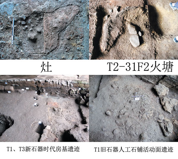 火膛3个:火膛2开口于④层下,呈不规则方形,斜直壁,平底,堆积主要为红烧土和黏土质砂,包含石片,石块,螺壳和少量碎骨等。火膛1、3均开口于⑤层下,近圆形,斜直壁,近平底,深灰色土,夹杂大量红、灰烧土颗粒,结构疏松,呈坑状堆积,包含大量木灰烬,少量夹砂灰陶片、钙结核及石片、断块等。