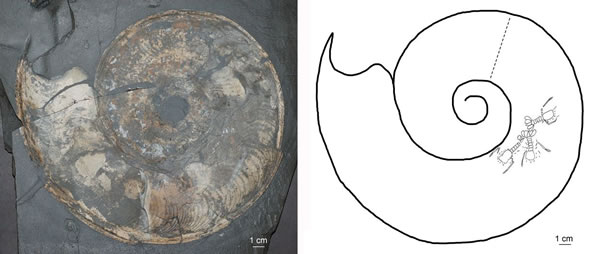 Posidonia页岩优越的保存条件使得研究者能利用低角度光线透过菊石半透明的、薄的蜕壳(periostracum)观察到其内的龙虾。菊石壳体内的龙虾呈尾部互相对着的状态,并组成一个圈形,Klompmaker说,为何这些龙虾会呈现这样的保存状态目前仍不清楚,它们可能曾在这里暂时藏身以躲避天敌,或是一直栖居于此。