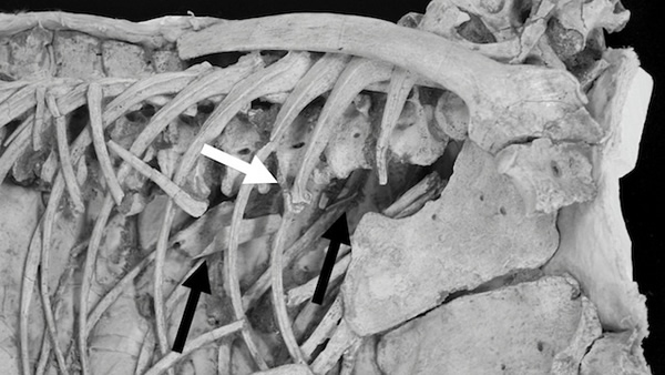 这具驰龙化石于1994年出土于戈壁沙漠。驰龙的胸廓里赫然是一段7.5厘米的翼龙骨骼,就处在胃的位置。“翼龙骨骼表面光滑,保存良好,没有胃酸腐蚀的痕迹。因此驰龙是在吃了一顿翼龙大餐后,不多久便命归西天。”Hone解释说。“经过我们进一步研究,发现这只驰龙肋骨处还有尚未完全愈合的伤口,这使整个事件更加扑朔迷离。”