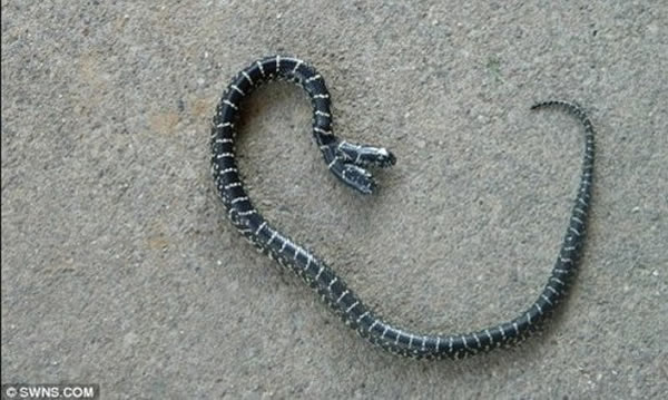 据报道,来自美国田纳西州克拉克斯维尔(Clarksville)的卡威尔先生(Mr Carver)在施布除草剂时,发现了一些幼年时期的蛇。经近距离观察,他发现其中一条有两个头。