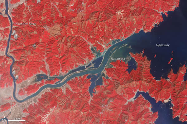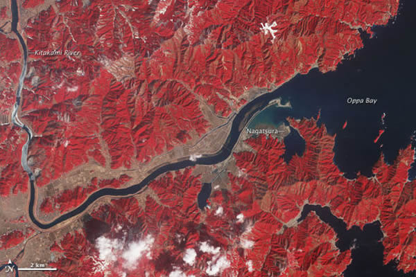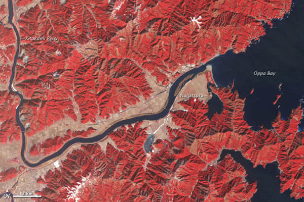 第一幅照片是由美国国家航空航天局的地球观测卫星1号(EO-1)上的先进陆地成像仪拍摄的,显示了一年后北上川流域的地貌。第三幅照片也是ASTER拍摄的,显示地震发生前该地区的景象。这三幅照片都是伪色照片,可以很容易区分水和土地。在照片中,植被显示为红色,休耕田地显示为浅棕色。